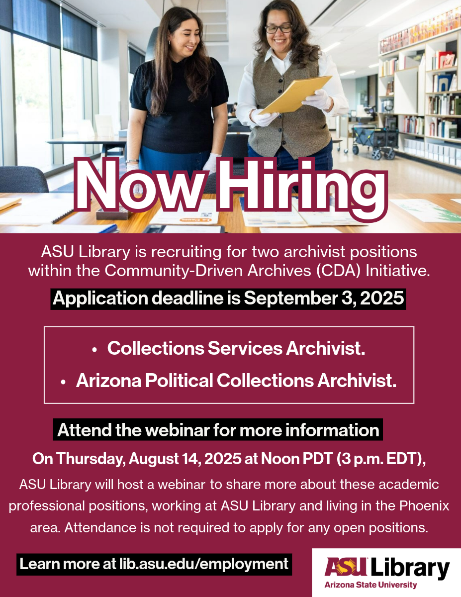 ASU Library is recruiting two archivist positions, Collections Services Archivist and Arizona Political Collections Archivist, within the Community-Driven Archives Initiative:. Early career professionals are encouraged to apply. The application deadline is Sept. 3, 2025.