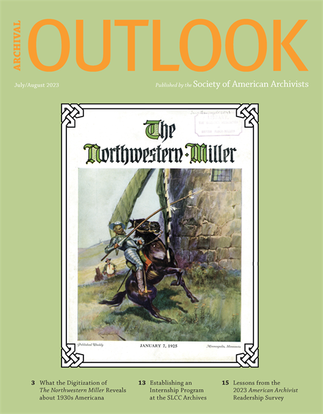 Explore the latest issue of Archival Outlook! In the July/August 2023 issue, Starlina Rose talks about the digitization of The Northwestern Miller trade magazine (a 1925 cover of which graces this issue's cover); Elizabeth Dunham, Harold Housley, Julie Tanaka, and Claudia Willett share a framework for implementing better accessioning practices to prevent burnout; and DiAnna Hemsath, Jessica Kowalski, and Caroline J. White reflect on what they learned on their nontraditional career paths into archives. Also in this issue, Amanda Greenwood and Eric Hung discuss results from the 2023 American Archivist readership survey, Cali Vance uses reparative archival description to create a K–12 archives, and Lydia Tang shares new tools used in the SAA Mentoring Program. Read the digital version here. Print edition to follow.