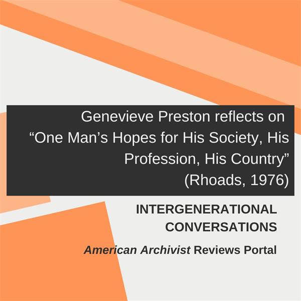 In the latest Intergenerational Conversations review on the American Archivist Reviews Portal, Genevieve Preston (San Bernardino County Historical Archives) considers former SAA President James B. Rhoads’s presidential address, “One Man’s Hopes for His Society, His Profession, His Country” (1976). She writes, “My hope, and belief, is that we are ever evolving as a profession, just as we are as human beings.” Read the full review here.