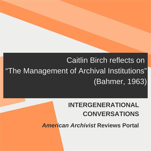 In the latest review from the Intergenerational Conversations series on the American Archivist Reviews Portal, Caitlin Birch (James Madison University Libraries) considers Robert H. Bahmer's presidential address, "The Management of Archival Institutions" (American Archivist, 1963). Birch writes, "I am not the manager Bahmer had in mind.... And yet a surprising degree of what he wrote is recognizable in the archival landscape of today, although perhaps not in the ways he might have expected." Read the full review here.